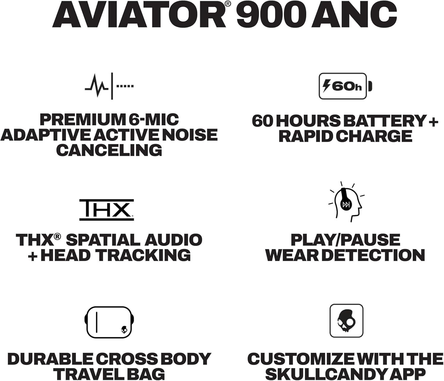 Skullcandy Aviator 900 ANC Wireless Over-Ear Bluetooth Headphones, THX Spatial Audio with Head Tracking, Adaptive Noise Cancelling, Up to 60 Hours Battery, Microphone for iPhone Android - True Black
